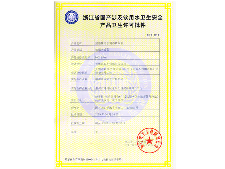 浙江省國產涉及飲用水衛生安全產品衛生許可批件